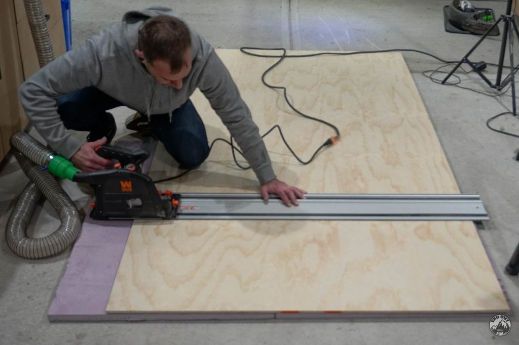 Start by cutting the two pieces of plywood; a Track Saw with Guide allow to make a precise straight cut (safer and better dust collection than a circular saw):