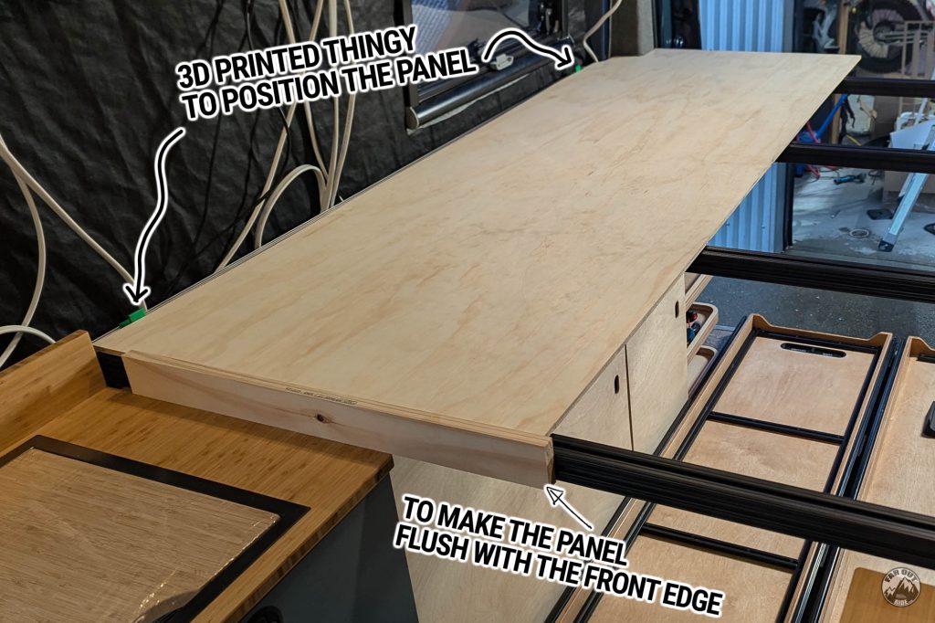 Move the panel to its final location, ensuring the t-nut remains undisturbed. That’s flush with the outer edge of the front extrusion, and flush with the inner edge of the North-South extrusion. We made a 3D Printed Platform Bed Alignment Jig, but it’d be OK to eyeball it 😉