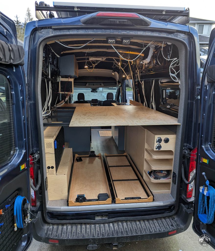 With the bed platform bolted to the 8020 frame, the structure as a whole is a lot stronger, and rotation of the rear-most East-West frame is a non-issue. We even cantilevered the bed platform further into the rear door area than in your first van build, which allowed us to free up a few inches in front for other living space.