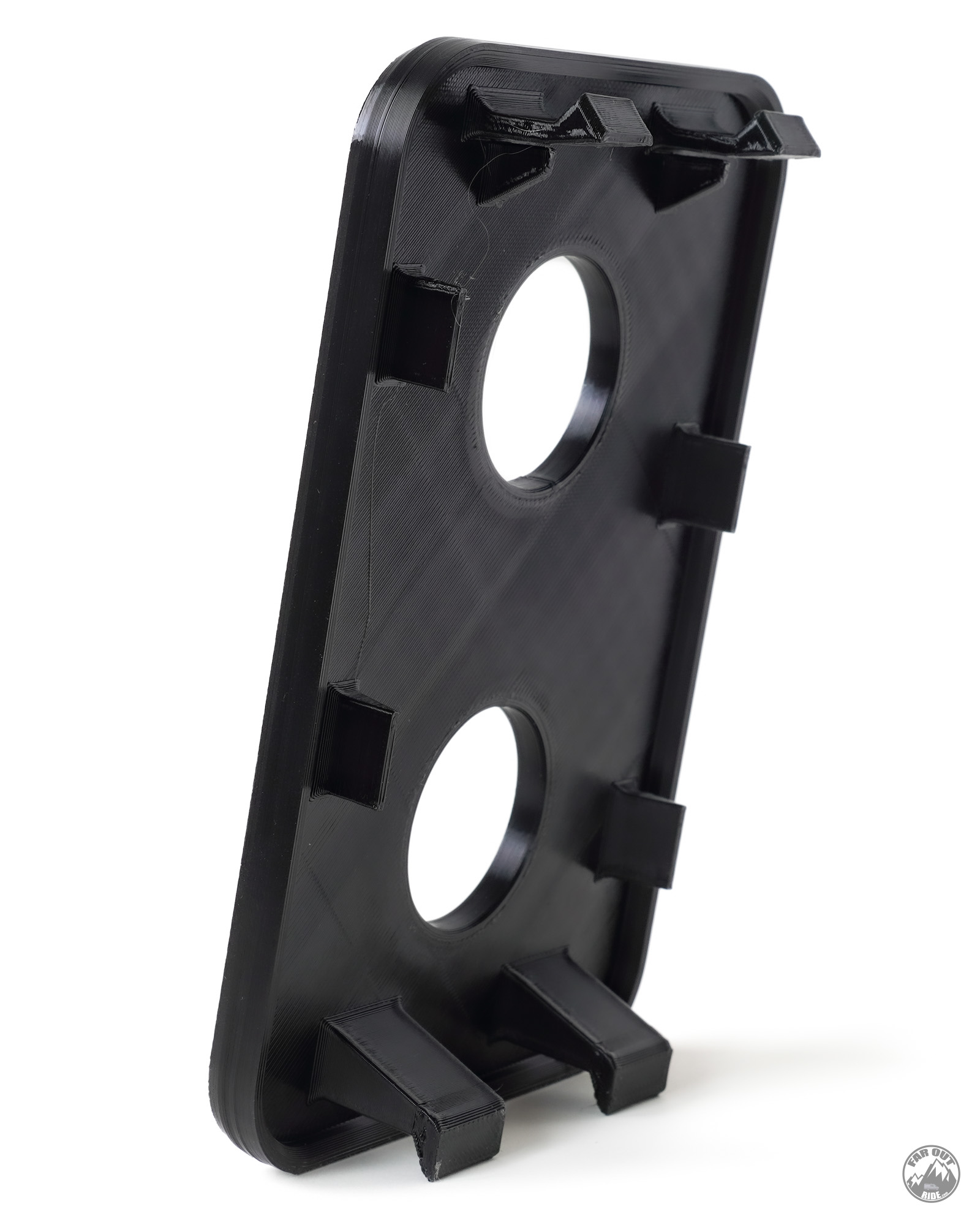 Use this plate to add outlets (USB, 12V socket, etc.) to your upholstered D-Pillar. The plate snaps into the existing cutout on the passenger or driver side of the Ford Transit. Both cutouts in the plate are 30mm (1.2 in) in diameter and should accept any panel-mounted socket held with a nut.