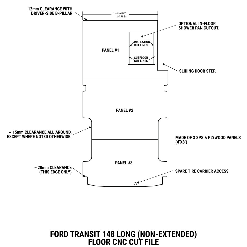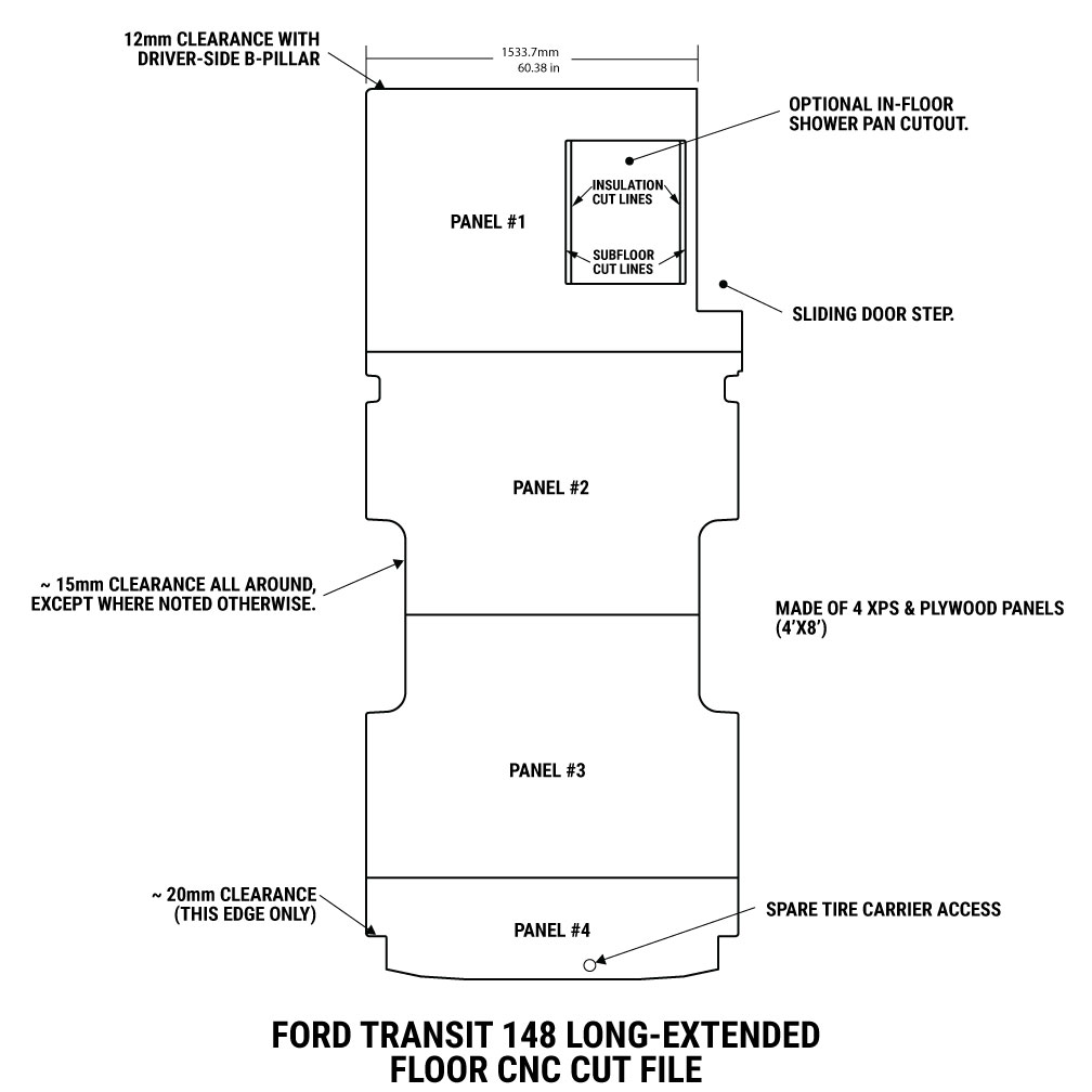 Use this .dxf file to CNC-cut the floor of your Ford Transit (rigid insulation & plywood subfloor). Before downloading this file, scroll down and review the details.