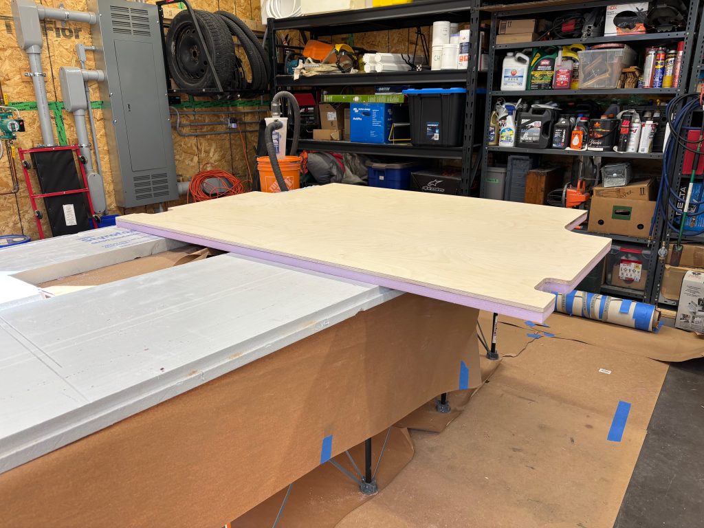 - Insulation (foam board) and subfloor (plywood) contour. About 15mm gap with the van’s walls.