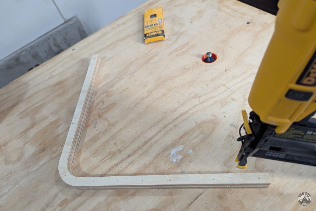 And I use a Brad Nailer to add 3/4″ brad nails (from the bottom, which is not visible) to clamp them together: