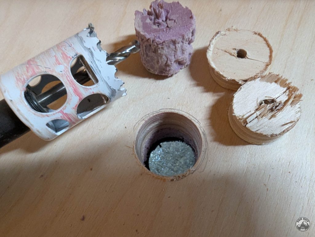 I then used a 1.25″ hole saw to cut through the water cabinet and the floor: