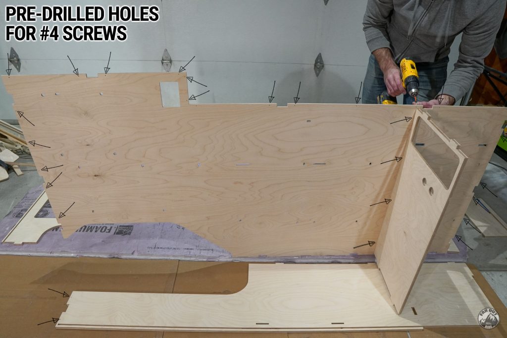 New for this cabinet, I added holes for #4 screws in the CNC files. The screws provide better clamping than brad nails, and they minimize the need for clamps (which are kind of a pain to use and not cheap). We’re learning!